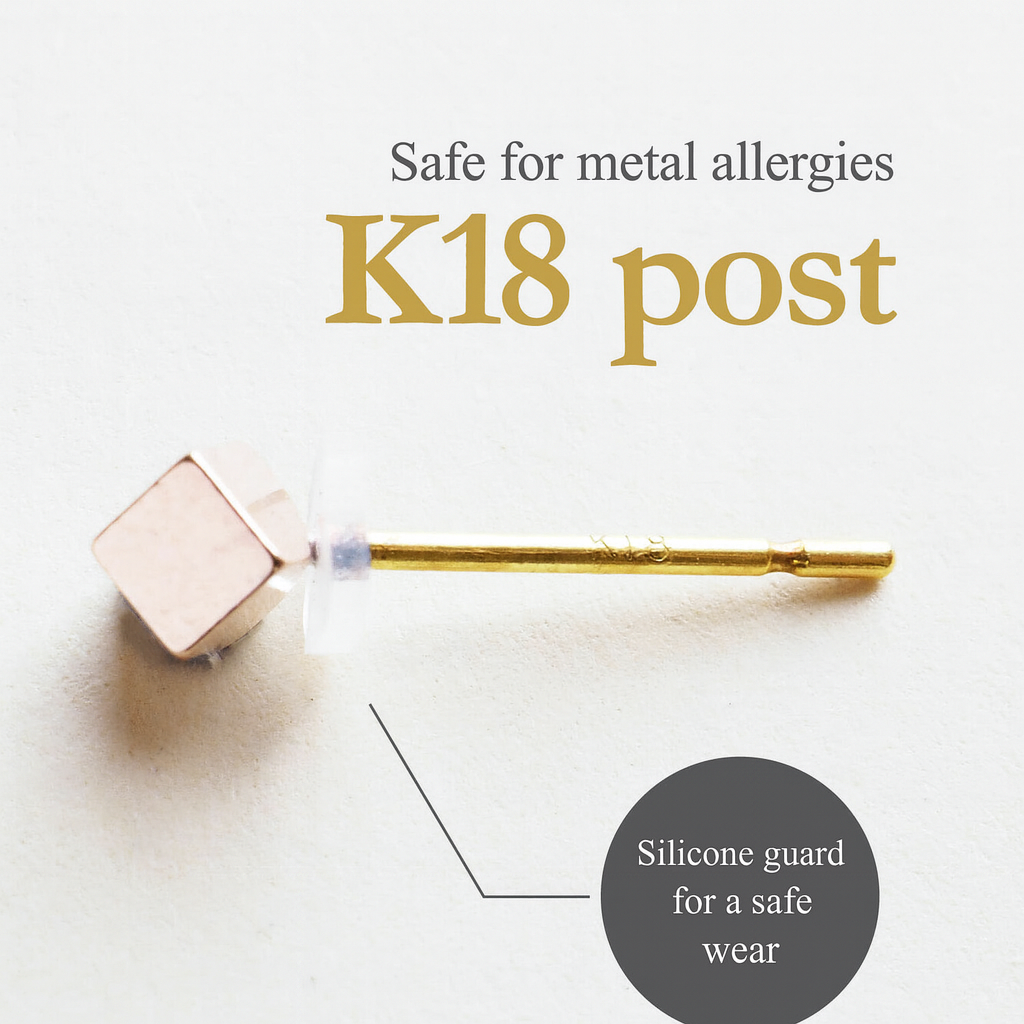 The earring posts are made of 18K gold, which is less likely to cause an allergic reaction. The posts are stamped with “K18” to verify their purity. By using this precious 18K gold only for the posts, these earrings combine beautiful design with a luxurious feel.