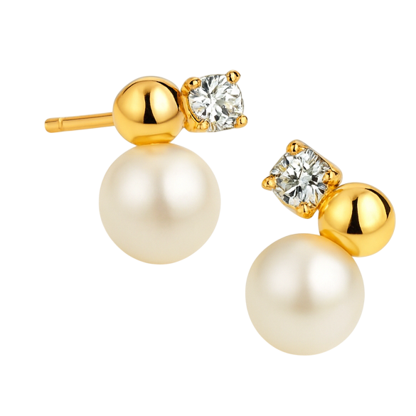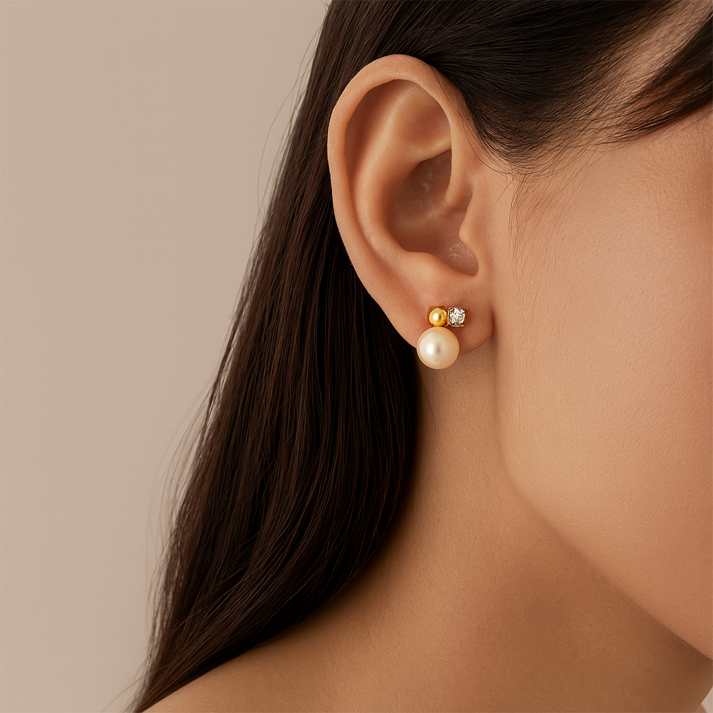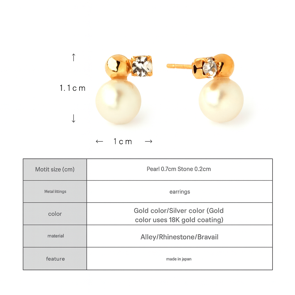 These small asymmetrical earrings feature round pearls set with small metal balls and stones.
