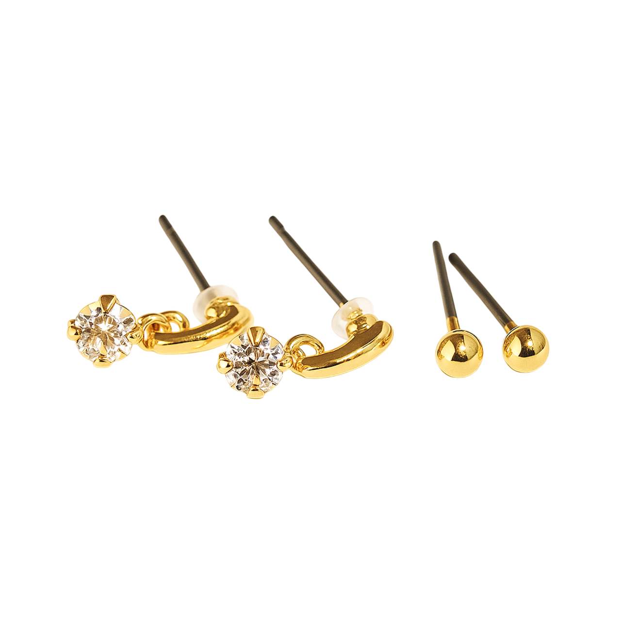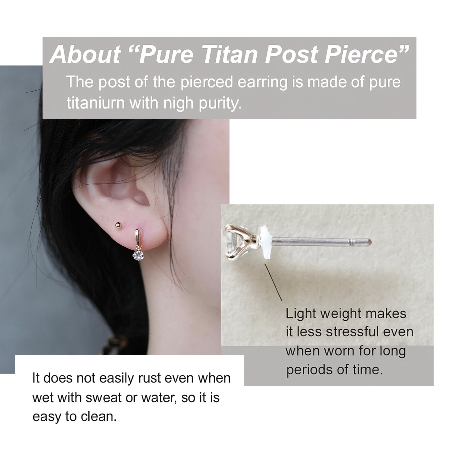 These earrings use highly pure 99.6% titanium, making them less likely to cause an allergic reaction. The pure titanium posts, along with a silicone guard between the post and the motif, and silicone catches, provide excellent protection against metal allergies. The set includes a cubic zirconia that sparkles just like a diamond and a simple spherical motif, making them easy to match with any outfit and perfect for layering. These are a must-have item.