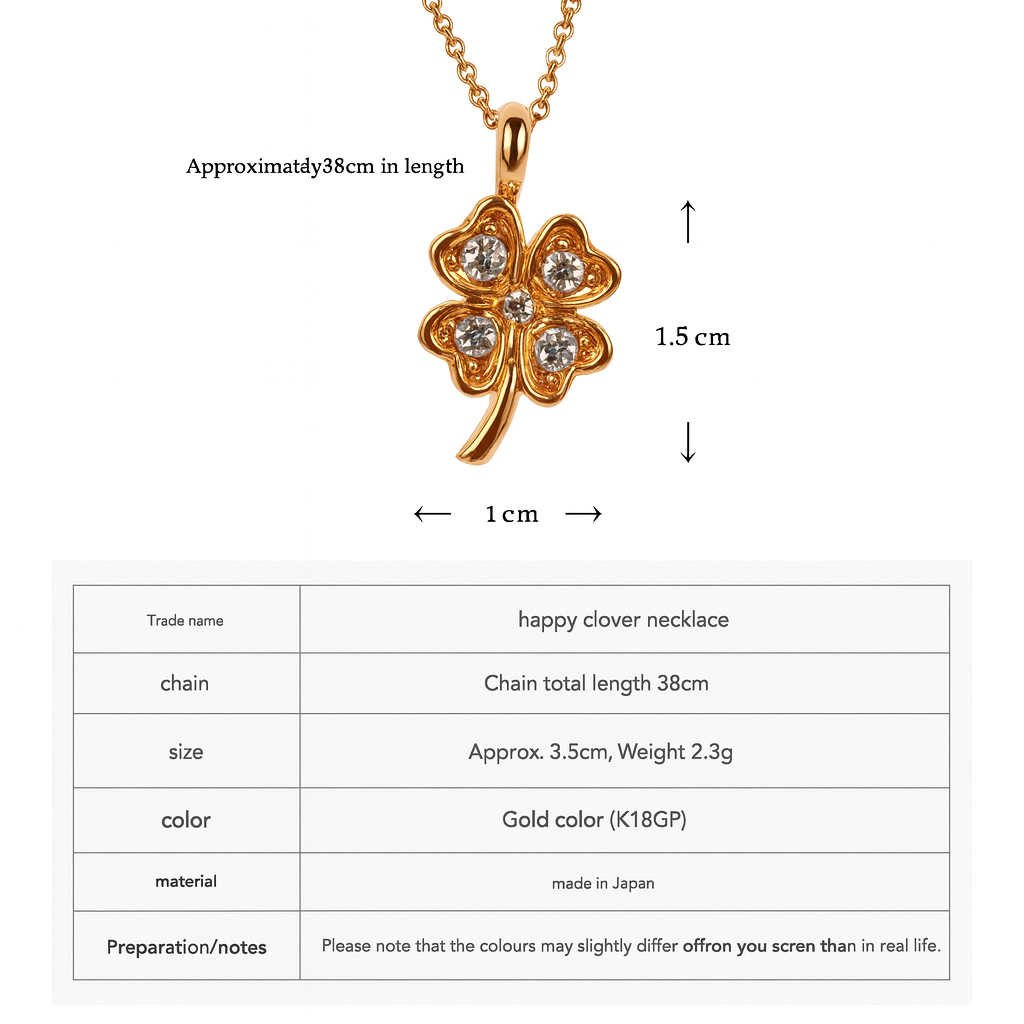 This necklace features four sparkling rhinestones and an 18K gold coating, a testament to its quality Japanese craftsmanship. Perfect as a charm to attract happiness, it makes an ideal gift for a loved one or a well-deserved treat for yourself.